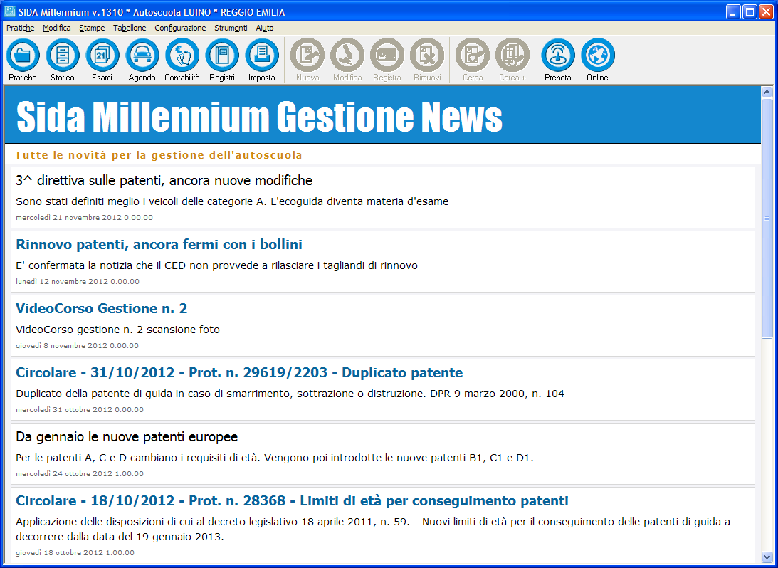 Per consentire a tutti i clienti di essere sempre al corrente di tutte le novità tecniche e operative inerenti i software SIDA, a partire da questo aggiornamento verranno visualizzate in automatico, all'apertura di SIDA Gestione, tutte le notizie relative al Gestionale. In particolare, si potranno agevolmente consultare videocorsi, istruzioni operative, ma anche novità normative da conoscere per operare correttamente con SIDA Gestione. Cliccando sulla news da approfondire, verrà effettuato un collegamento al sito www.patente.it per la lettura dell'intera notizia.