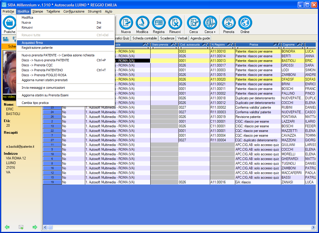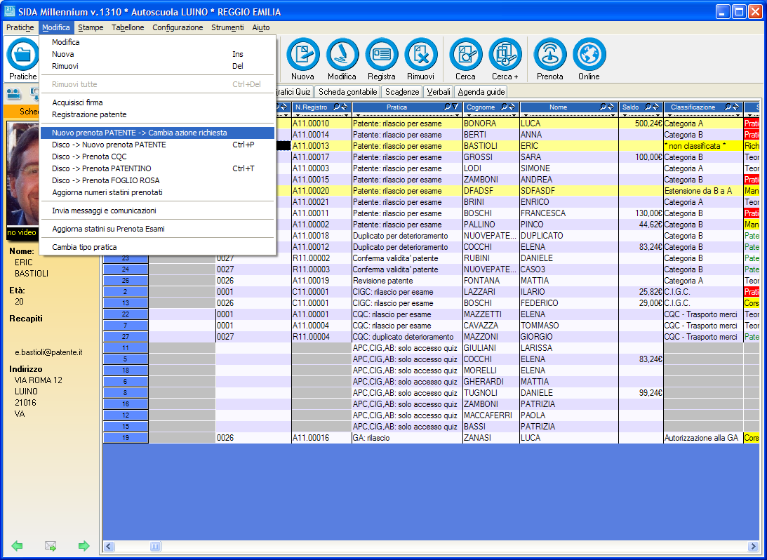Fare clic sulla pratica e poi sul menù modifica: