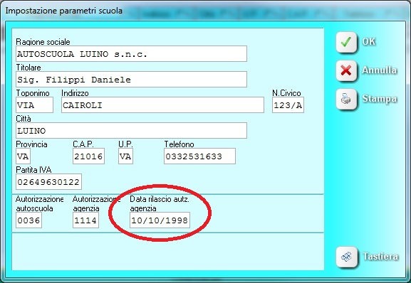 Andiamo su Imposta> Autoscuola e facciamo doppio clic sul nome della nostra agenzia. Si aprirà la maschera qui sotto nella quale dovremo inserire la data di rilascio dell’autorizzazione agenzia. La data verrà stampata sul Registro nella prima pagina.