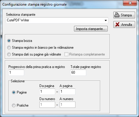 Con la voce Pagine dobbiamo selezionare il numero della pagine del registro da stampare o definire un range di pagine.
