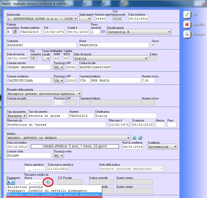 In Pratiche selezionando una pratica di Conferma validità in basso a sinistra troveremo la sezione dedicata a Pagamento e Recupero credito da marca. Selezioniamo da Pagamento la voce "R Recupero Credito" (credito su pratica annullata) e clicchiamo sull’icona €: si aprirà una maschera da dove è possibile selezionare la marca operativa per recuperare il credito. Perché questa funzione sia attiva è necessario avere la VPN SIDA installata, la matricole impostate nel modo corretto e il TuttoPrenota in licenza.