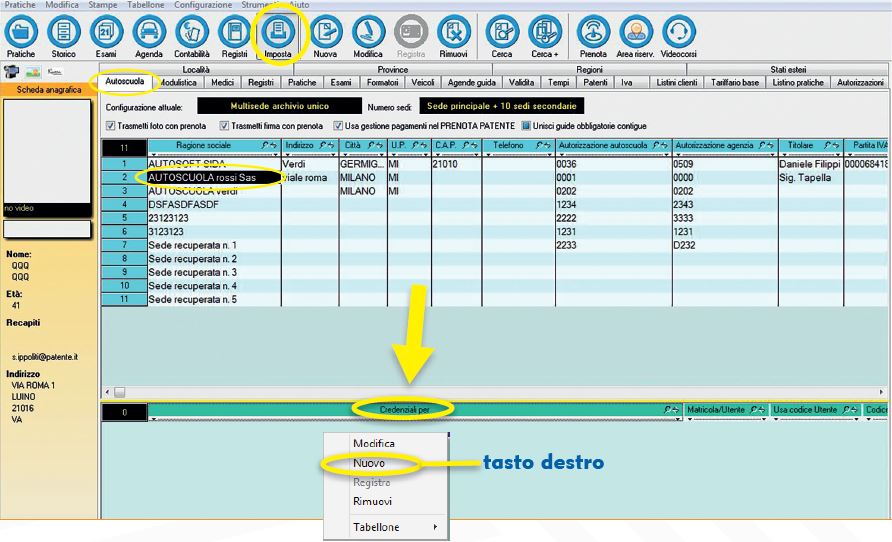 ATTENZIONE: Se il sistema non ci permette di spuntare la sede desiderata, vuol dire che non abbiamo impostato per tale sede la LOGIN e la PASSWORD di accesso all’Area personale patente.it. Andiamo quindi sul bottone Imposta, selezioniamo dalla tab (linguetta) Autoscuola la sede desiderata e poi spostiamoci sul pannello subito sotto Credenziali per.