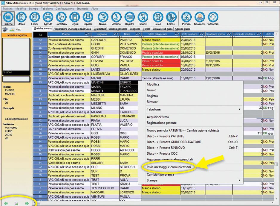 Se abbiamo bisogno di inviare lo stesso messaggio a più allievi, allora selezioniamo i nominativi che ci interessano dalla schermata principale di SIDA Gestione o da qualsiasi punto del software in cui è presente un nominativo (Storico, Esami, Agenda, ecc), clicchiamo sul tasto destro del mouse e scegliamo la voce Invia messaggi e comunicazioni.