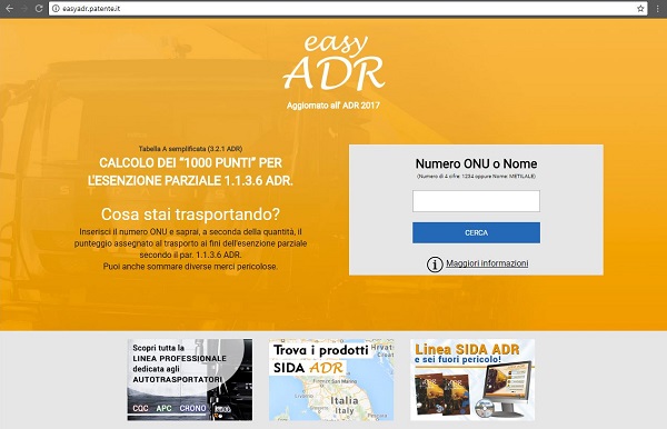 Easy ADR è l’applicazione on line che permette di consultare la tabella A del paragrafo 3.2.1 del trattato ADR in forma semplificata e di calcolare il punteggio delle merci trasportate ai fini dell’esenzione parziale – secondo le regole presenti nel par. 1.1.3.6 alla base del cosiddetto "calcolo dei 1000 punti".