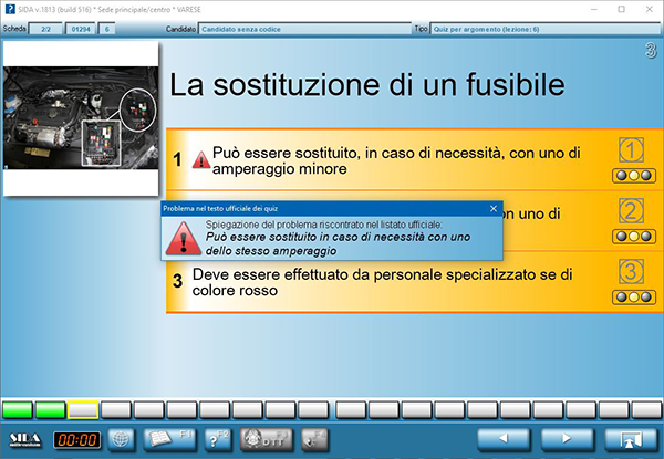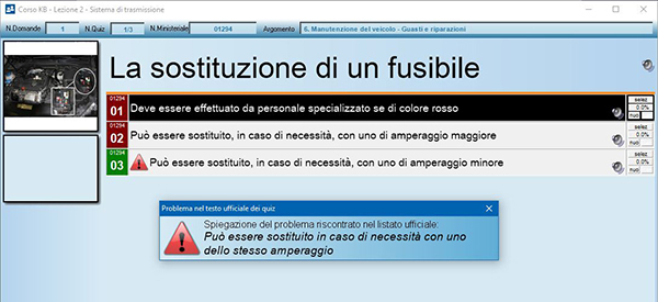 Il listato contiene alcuni errori di contenuto (ad esempio, una risposta è segnalata come vera ma invece è falsa o vice versa). Ovviamente non ci è possibile intervenire fino a quando il Ministero non avrà provveduto ad effettuarne la correzione ufficiale. In attesa che questo avvenga, è possibile per l'insegnante ed il candidato individuare questi quiz così come le motivazioni dell'errore, sia in aula, sia durante le esercitazioni nei quiz per argomento.