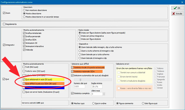 Nella maschera di configurazione mettere il segno di spunta sulla funzione "Quiz difficili Scuola e/o SIDA", colorata di arancione.