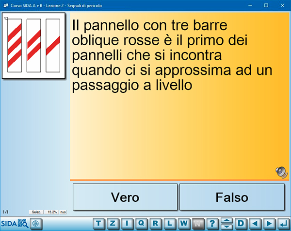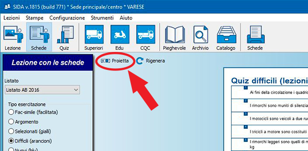 Se non si effettua nessuna ulteriore configurazione dei quiz difficili, SIDA proietterà da default solo i quiz che, a livello nazionale, riportano una percentuale di errore che parte dal 29,1% (nel nostro esempio, saranno proiettati 85 quiz relativi ai segnali di pericolo sui 1104 complessivi di tutto il corso per la patente A e B).