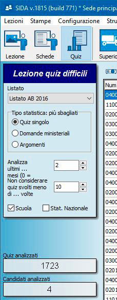 Il docente sta esaminando il lavoro di 4 candidati dell'autoscuola (vocce "candidati analizzati") sta prendendo in considerazione i quiz svolti almeno 10 volte (voce "non considerare quiz svolti meno di ... volte") negli ultimi 2 mesi (voce analizza ultimi... mesi), ossia presumibilmente dal periodo di inizio del corso AB. il docente sta lavorando sul listato della patente A e B 2016 (voce Listato nell'immagine) Il docente sta esaminando i singoli quiz, ovvero le singole affermazioni più sbagliate di tutto il listato ministeriale per la patente A e B (voce "Quiz singolo" nell'immagine) Il docente sta lavorando sulla base della statistica dei suoi candidati degli ultimi 2 mesi (casella Scuola) Infatti i quiz analizzati per la statistica sono ora solo 1.723 (voce "quiz analizzati") e i candidati "solo" 4 (voce "candidati analizzati") |