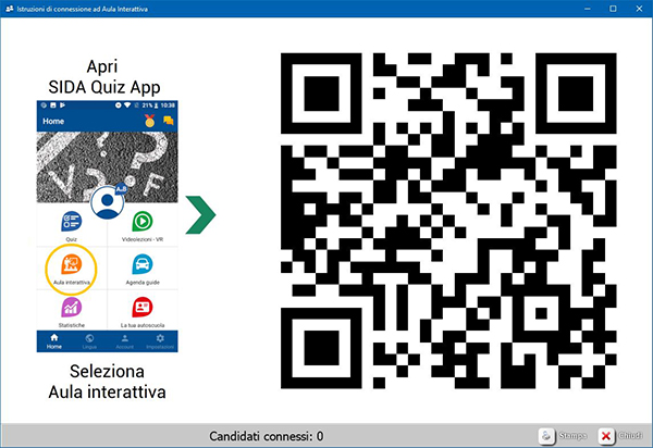 La modalità "aula interattiva" richiede, per il funzionamento, la presenza di una connessione internet sul computer aula, che è necessaria per poter attivare il collegamento tra gli smartphone dei candidati e il pc dell'autoscuola.