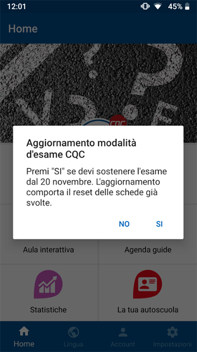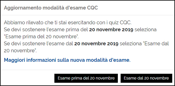 questo aggiornamento contiene la nuova modalità d'esame prevista per il primo conseguimento della CQC, così come stabilito dal decreto 5 luglio 2019, pubblicato in G.U. lo scorso agosto. La nuova modalità d'esame entrerà in vigore a partire dal 20 novembre 2019.