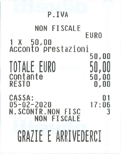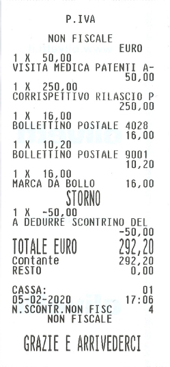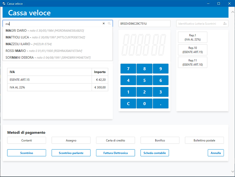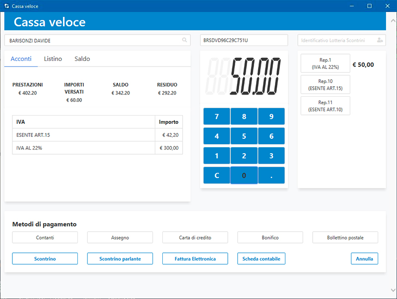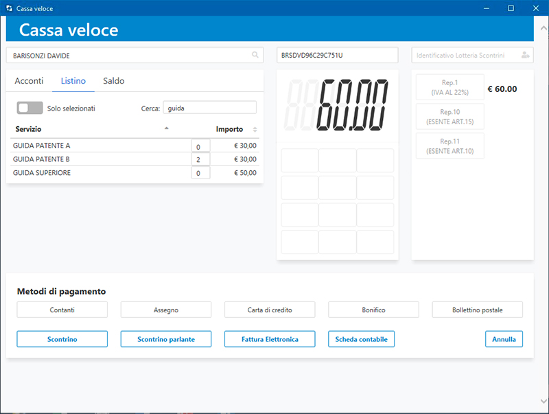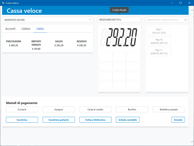 La cassa può produrre sia scontrini normali che scontrini parlanti (con l'indicazione del codice fiscale del cliente).