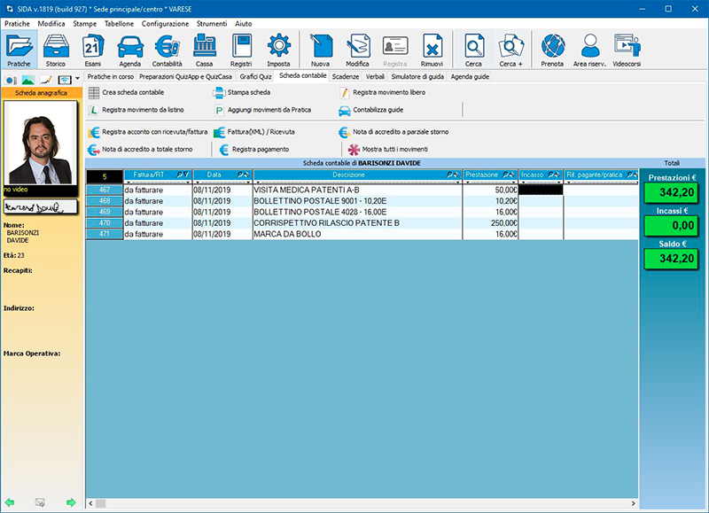 Il conto (la scheda contabile) del cliente e la contabilità dell'autoscuola vengono aggiornate automaticamente con la registrazione della prestazione.