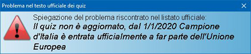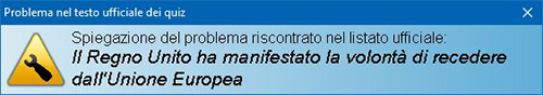 A seguito di questa modifica normativa, il quiz 06006 V05 (Il Regno Unito è membro UE ma non è interno allo spazio Schengen) presenta delle inesattezze. Pertanto è stato segnalato con la seguente dicitura: