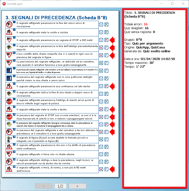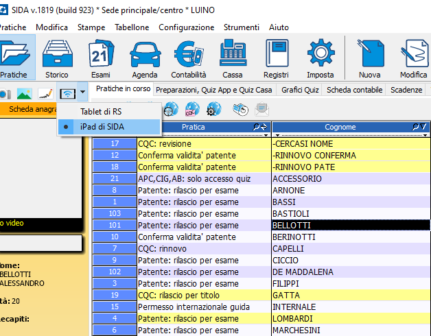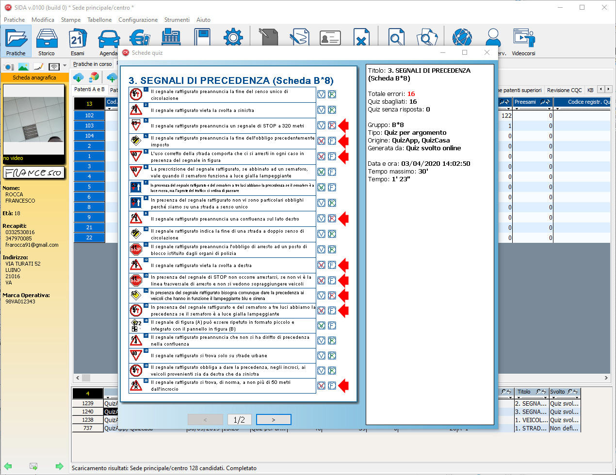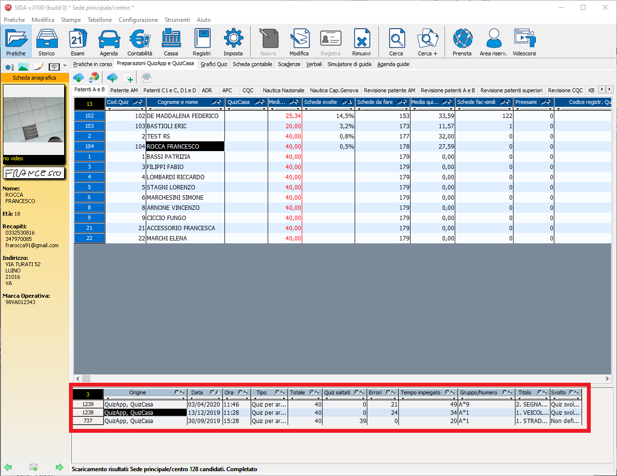 Tutti i quiz svolti in autoscuola (SIDA Quiz) o a casa (ad esempio con SIDA Quiz App vedi immagine sottostante) dal candidato appariranno nella tabella (foto sopra rettangolo rosso).
