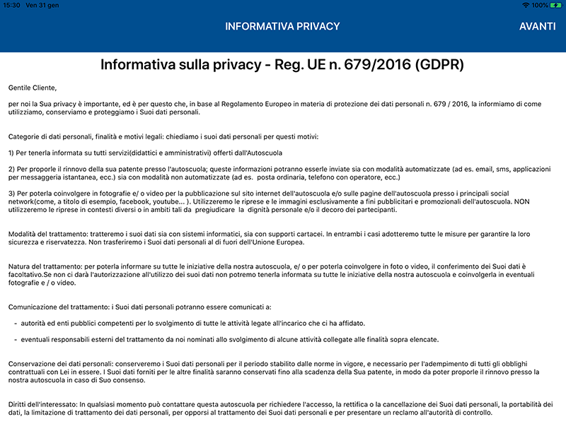 - e per la procedura richiesta ai fini del GDPR (Informativa sulla Privacy)