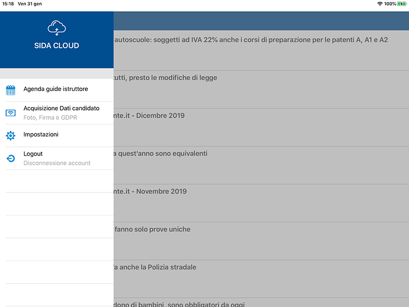 Cliccando sull'icona in alto a sinistra (le tre linee orizzontali bianche) compare il menu laterale da cui è possibile accedere all'agenda guide istruttore, all'acquisizione dei dati dal candidato (foto, firma e GDPR), alle impostazioni dell'applicazione e al logout (disconnessione).