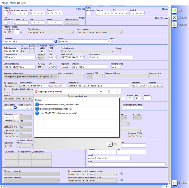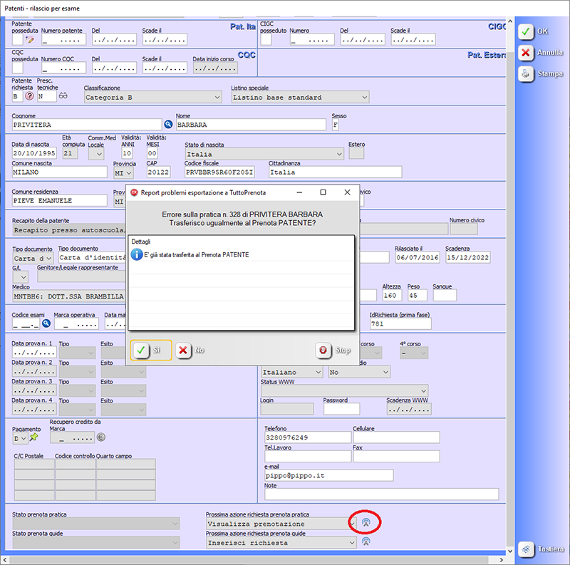 Dopo aver premuto il pulsante indicato nella maschera, prima della trasmissione vera e propria, vengono eseguiti tutti i controlli del caso, gli stessi che vengono eseguiti nella procedura di esportazione presente nel tabellone (disco PATENTE). Premendo "Si" la pratica viene trasmessa.