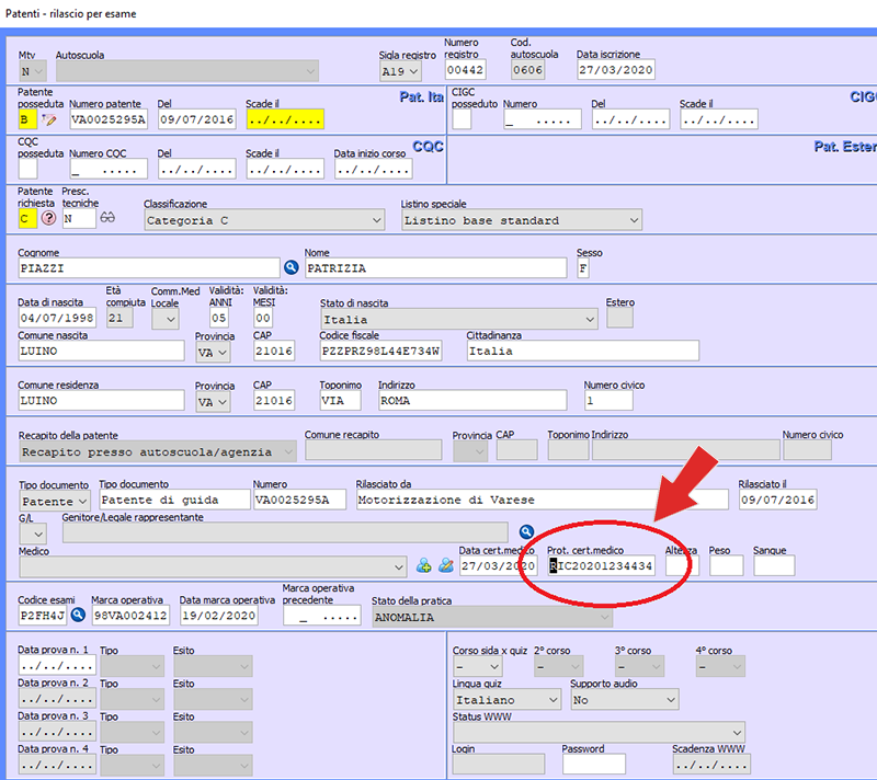 Modificata la maschera di inserimento PrenotaPatente (Esami/Duplicati/Conversioni) per la gestione del campo "Protocollo certificato medico". La compilazione di questo campo (evidenziato nell'immagine di seguito) comporta una trasmissione dello stesso a TuttoPrenota, il quale sarà in grado di selezionare il corretto web service in fase di invio.