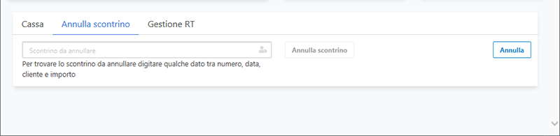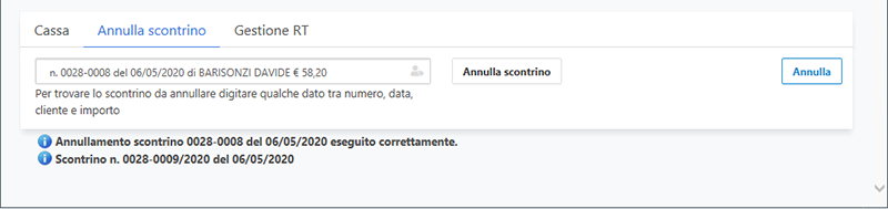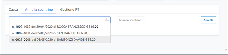Sarà possibile scegliere lo scontrino desiderato e premere il pulsante Annulla scontrino. Verrà quindi annullato il documento selezionato stampando un documento di annullo.