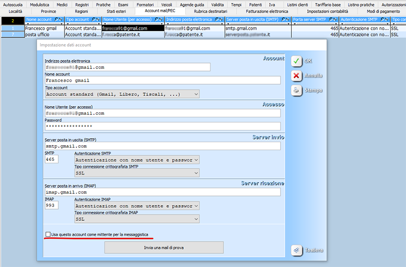 Sfruttando la possibilità offerta da Gestione di configurare il proprio account direttamente dalle impostazioni Account mail/PEC, è possibile utilizzare tale account per l'invio di mail dalla messaggistica.