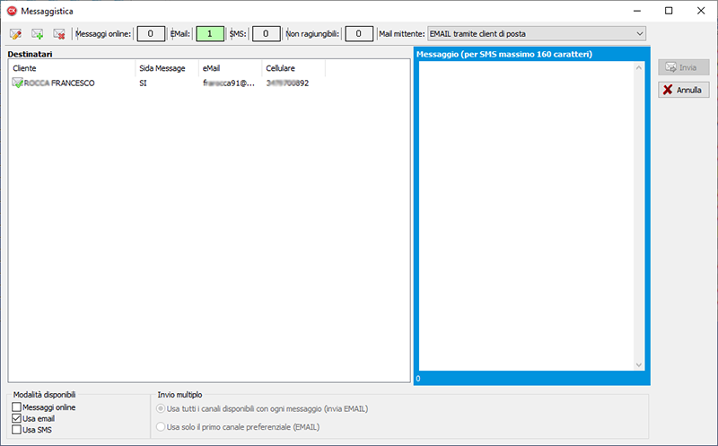 Si aprirà la finestra di messaggistica. È possibile notare che è presente una voce aggiuntiva, ovvero la mail del mittente che mostrerà un elenco delle mail configurate su Gestione nelle impostazione viste prima.