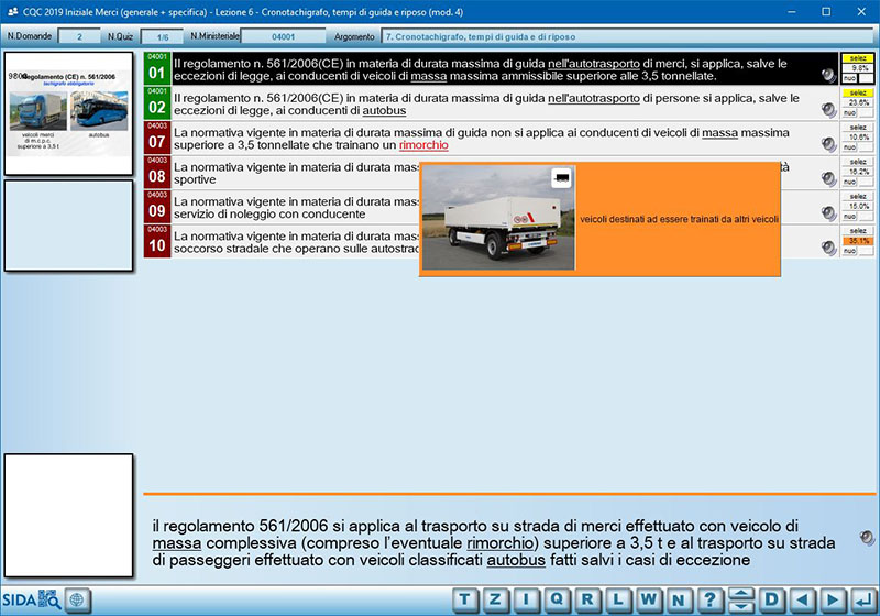 - Dizionario tecnico completo: comprende le definizioni dei termini tecnici del Codice della strada ma anche della contrattualistica internazionale per il trasporto merci e/o persone utilizzati nei quiz ministeriali per la CQC (ad esempio: "Pneumoidraulica", "Usufrutto" oppure anche "Multilaterale"). Questo vocabolario, che riguarda i termini più tecnici e difficili, comprende 458 definizioni.