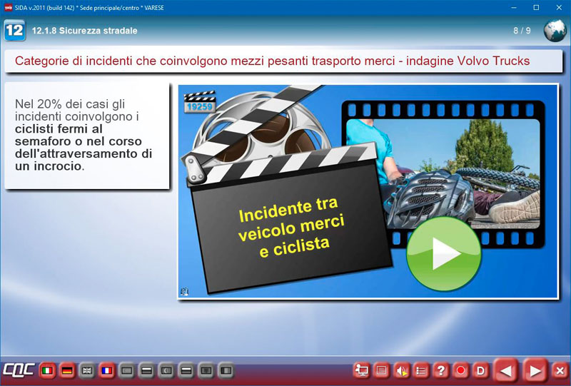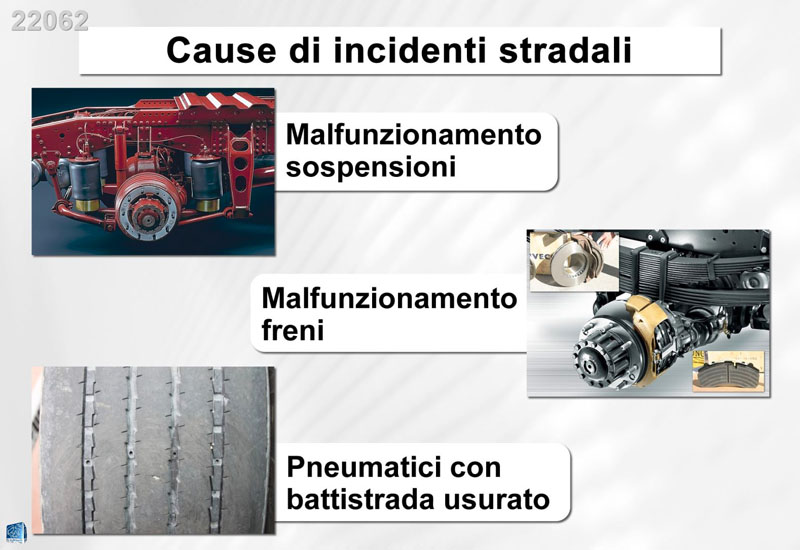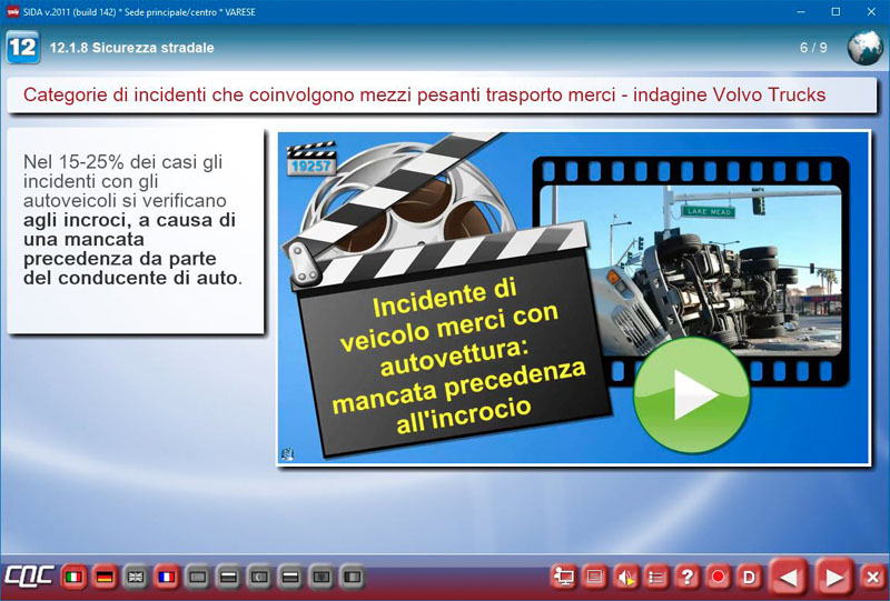 L'ora dedicata alla sicurezza stradale è stata integrata con contenuti multimediali, relativi ai risultati di una indagine condotta da Volvo Trucks per individuare quali fossero le categorie di incidenti che coinvolgono i mezzi pesanti di trasporto merci. Sulla base di questa ricerca abbiamo elaborato del materiale multimediale che illustra le principali cause di incidente che coinvolgono i mezzi pesanti, anche rispetto alle altre categorie di veicoli e degli utenti deboli della strada.