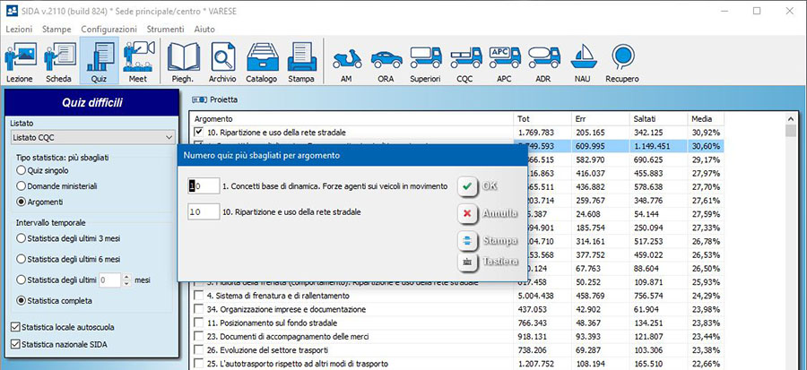 Una volta messo il segno di spunta sugli argomenti di interesse, cliccando nella tabella si può decidere il numero dei quiz più sbagliati per argomento che si desidera proiettare, modificando il numero proposto in automatico da SIDA e confermando con OK.