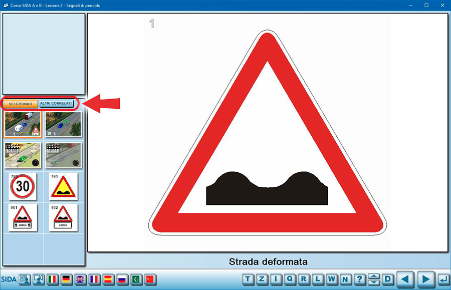 Quindi, ad esempio, in questa immagine il quiz proiettato è il numero 13 di 425 quiz totali presenti nella lezione dei segnali di pericolo.