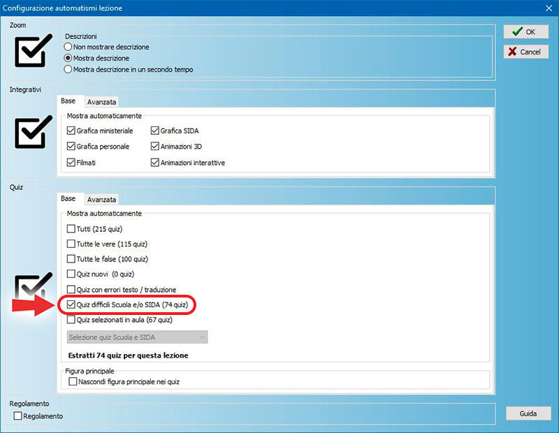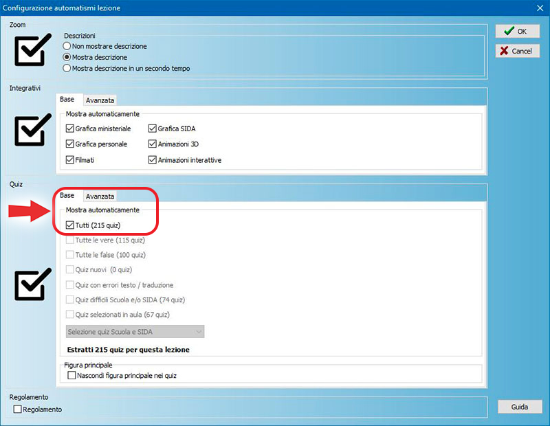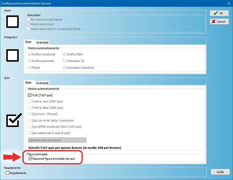 Per fare questo, mettere il segno di spunta alla voce "Nascondi figura principale dei quiz" nella maschera di configurazione lezione. I quiz vengono proiettati solo con la figura ministeriale (come all’esame).