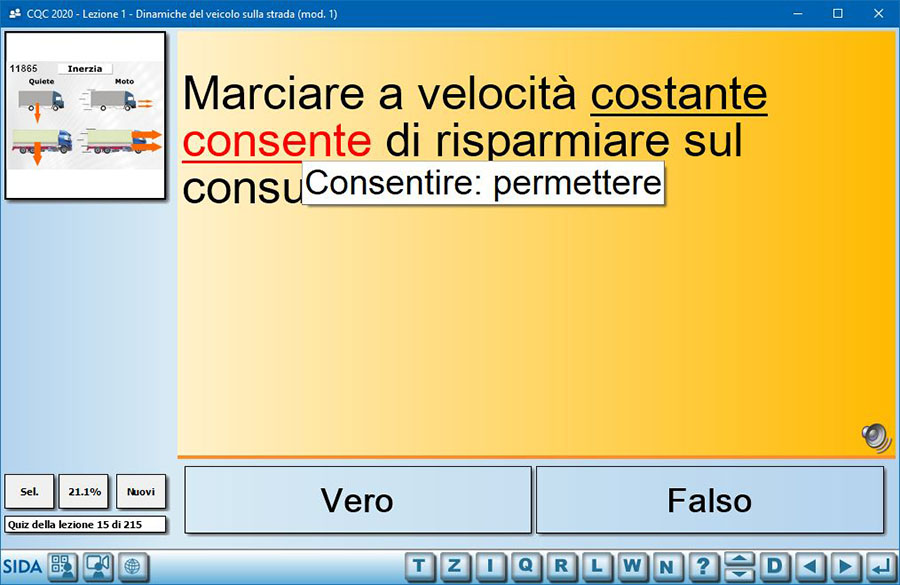 Ad esempio, nella lezione n. 1 subito dopo le immagini che illustrano il concetto di "inerzia" vengono presentati tutti i quiz ministeriali (16) che parlano di inerzia. Il candidato acquisisce in modo completo il concetto espresso.