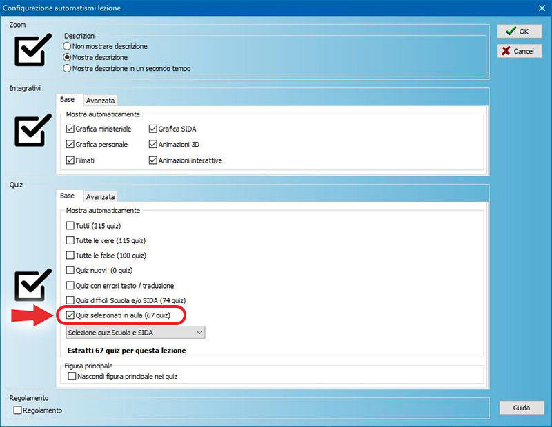 - a questo punto si consiglia di attivare la proiezione dei quiz selezionati in aula dal configuratore della lezione