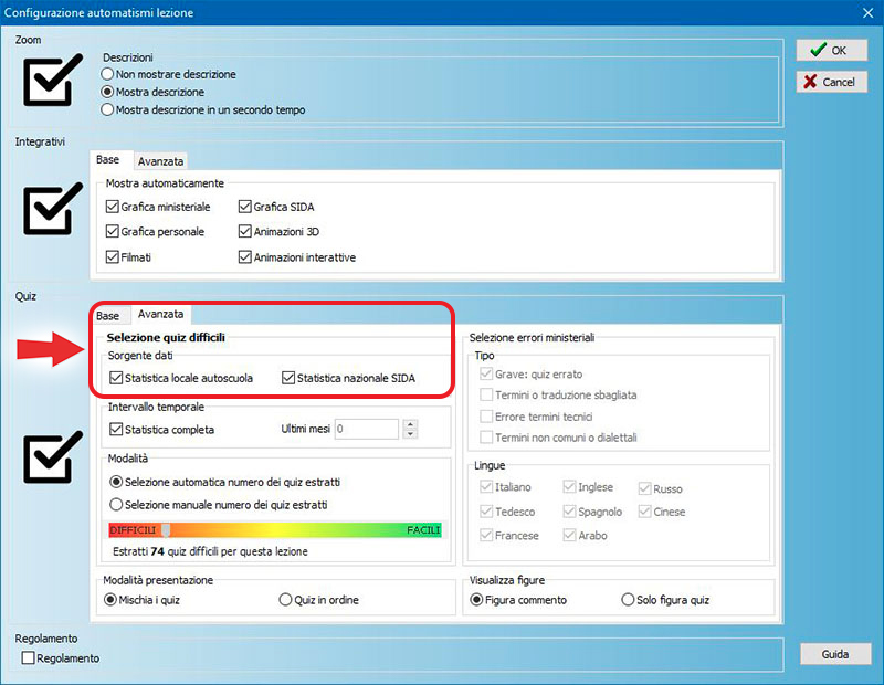 - Se nelle opzioni avanzate del configuratore si sceglie "Statistiche locale di questa autoscuola" verranno presentati i quiz più sbagliati della propria scuola (normalmente corrispondono alla selezione Nazionale)