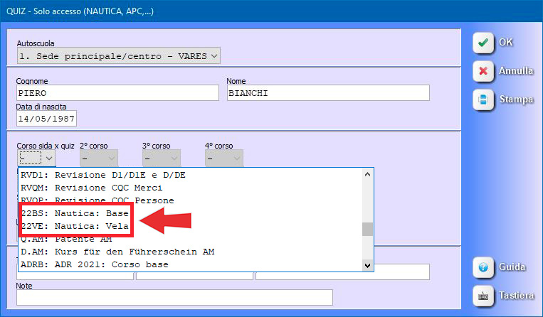 SIDA Gestione permette di gestire le esercitazioni dei candidati in base alla tipologia di esame (Base oppure Vela o entrambi). E' sufficiente spuntare il corso o entrambi i corsi desiderati, nelle caselle “Corso sida x quiz”.