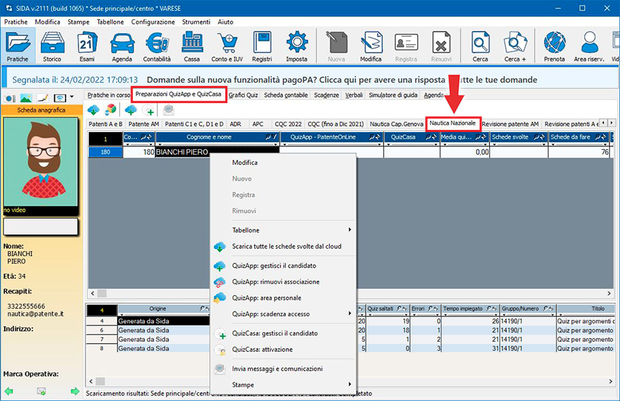 Per l'assegnazione delle esercitazioni on line dei candidati cliccare su Preparazioni, Quiz App e Quiz Casa, selezionare Nautica nazionale e con il tasto destro del mouse sul nominativo del candidato da far esercitare. Selezionare la modalità di esercitazione desiderata dalla lista che appare a schermo e seguire le istruzioni per ciascuna di esse.