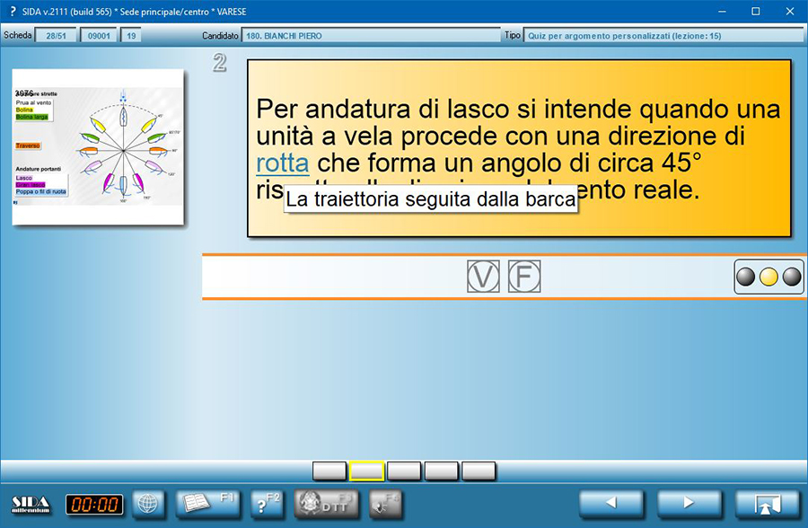 Tutte le esercitazioni (sia per la parte Base, sia per la Vela) sono complete di F1 per l’aiuto ai candidati (cliccando F1 durante la risoluzione dei quiz nei livelli 1 e 2 (teoria e quiz per autoapprendimento e quiz per argomento) appare la pagina del manuale di SIDA Nautica relativa al quiz da risolvere per aiutare il candidato.