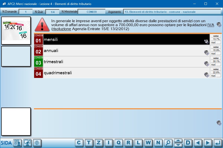 Pertanto, i due quiz in oggetto (così come gli altri quiz che, nel tempo, sono diventati errati rispetto alla evoluzione normativa), sono segnalati con il triangolino rosso, visibile sia durante la lezione con SIDA AULA, sia durante le esercitazioni con i quiz per argomento.