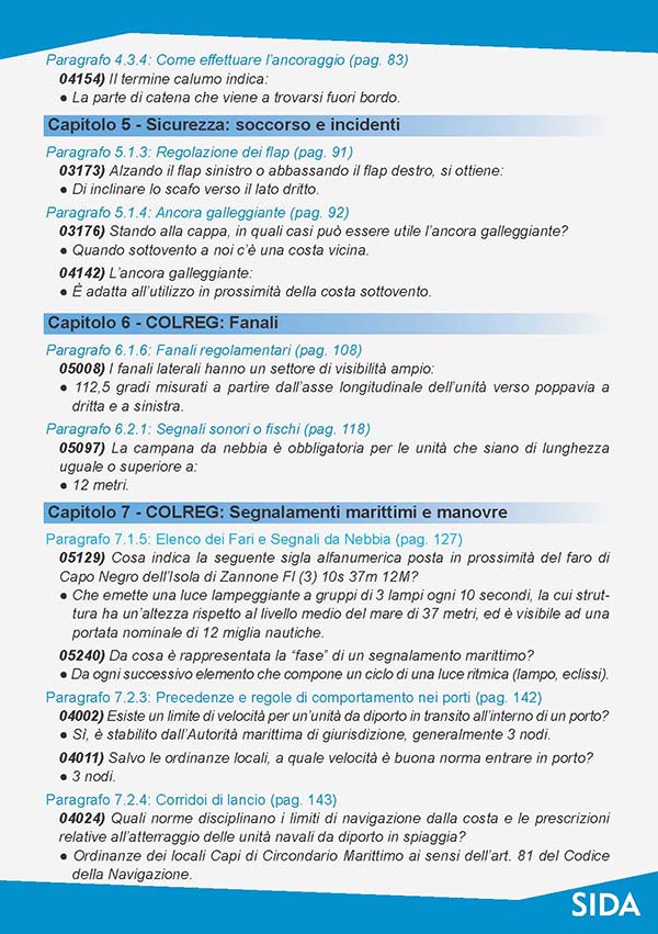 Coordinato a SIDA Aula e SIDA QuizApp, permette di prendere conoscenza della materia in modo semplice e veloce, con testi essenziali ed esplicativi solo dove necessario per la comprensione dei concetti più complessi. In carattere più piccolo sono presenti diverse note di approfondimento di carattere pratico, di sicuro interesse concreto per i futuri naviganti. In neretto sono invece evidenziati i termini "chiave" per la risoluzione dei quiz. Alla fine di ogni paragrafo ci sono le "vere" dei quesiti, articolati in terzine, per consolidare la preparazione e finalizzarla all'esame di teoria. Il testo è corredato da tantissime immagini, alcune contenenti QR code per la visualizzazione di animazioni e filmati extra. Un particolare e mirato lavoro di semplificazione riguarda il capitolo 7 sulla meteorologia e sulla navigazione dove con l'occasione sono state realizzate diverse e nuove immagini ancora più semplici e chiare rispetto a quelle pubblicate nel manuale di base. Per le esercitazioni è possibile utilizzare SIDA QuizApp Nautica. |