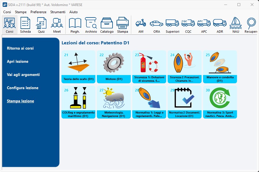 SIDA AULA, QUIZ e GESTIONE, nonchè la linea editoriale di SIDA sono stati integrati con tutto il materiale didattico necessario per l'attuazione dei corsi per la patente nautica D1.